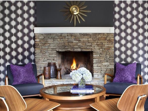 Tường nền làm nổi bật lò sưởi bằng đá mộc mạc, trong khi một nhóm các đồ nội thất hiện đại cung cấp cho khu vực chỗ ngồi ấm cúng.