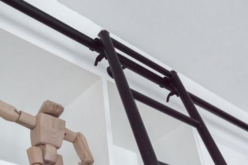 Chiếc thang được gắn bánh xe, chạy được trên một thanh sắt dọc theo chiều dài của tủ.